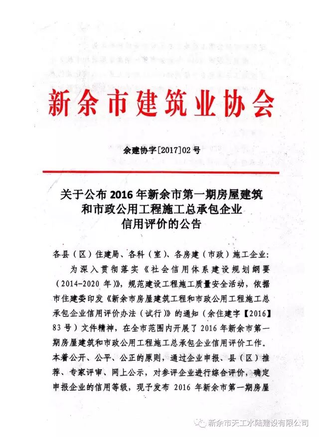 获得"新余市房屋建筑和市政公用工程施工总承包AAA级信用企业"称号,是天工水陆诚信经营的充分认可,同时也是一种鼓励和鞭策。天工水陆将始终秉承“创精品、树品牌、塑形象”的企业建设宗旨,以严谨的作风和精细的工匠精神,努力打造更多的精品工程奉献社会。